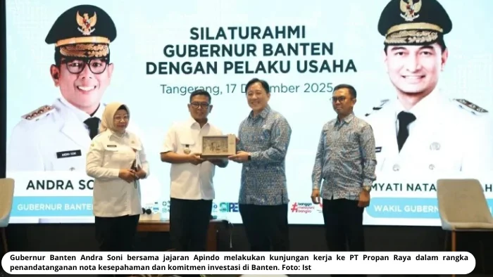 SERANG – Gubernur Banten Andra Soni bersama jajaran Asosiasi Pengusaha Indonesia (Apindo) melakukan kunjungan kerja ke PT Propan Raya dalam rangka penandatanganan nota kesepahaman dan komitmen investasi di Banten. Kunjungan ini menjadi momentum penting dalam memperkuat sinergi antara pemerintah daerah
